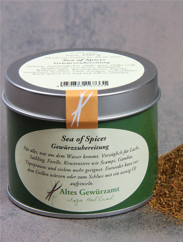 Tomatenflocken, Pfeffer grün, Pfeffer weiß, Bergkernsalz, rosa Beeren, Knoblauch, Wakamé-Algen, Korianderkörner, Paprika rosenscharf, Sternanis, Chili, Estragon, Lorbeerblätter. Für alles, was aus dem Wasser kommt.